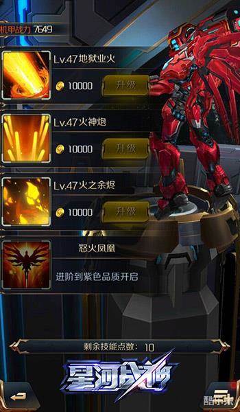 在技能的学习上,不要吝啬金币将之点完。火焰将军的每个技能都各有作用,地狱业火是强力的AOE技能,能够对BOSS造成大量伤害。火神炮则是增加炮火输出,火之余烬相当于量子护盾的一个防御技能。怒火凤凰是终极技能,通过损失生命值来对敌人造成伤害。同样,机甲技能的解锁和品质挂钩,所以也要尽早进阶机甲。