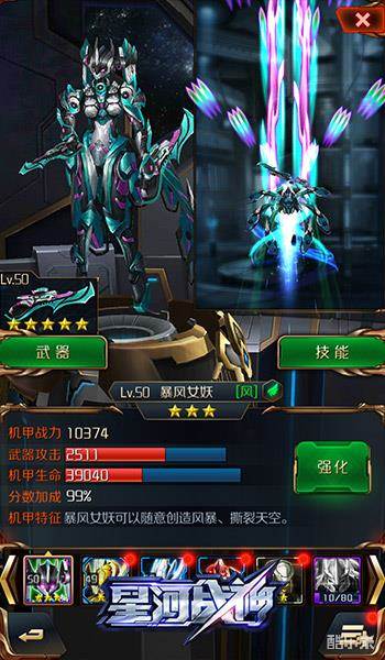 《星河战神》机甲中的唯一女性机甲,但却拥有超越大多男性机甲的战斗力和身法。绿色的铠甲下充斥着活跃开朗的身姿。攻击方式也是优美动人,处处散发着艺术的气息。暴风女妖也是目前机甲中可以用钻石获得的最贵的机甲,拥有初始五星的武器暴风光刃。而在攻击方式方面,暴风女妖也是近乎完美的,无论是小兵繁多的无尽模式还是有用超强BOSS的闯关模式,只要没有属性的克制,暴风女妖应付起来都是游刃有余。在游戏中对暴风女妖的描述是可以随意创造风暴、撕裂天空。这里小编想说的是,暴风女妖的声音也是格外的甜美呢!