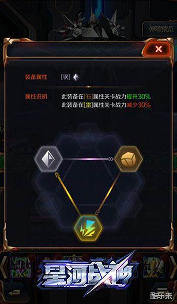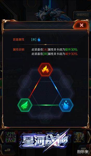 《星河战神》中机甲和装备都有属性的区分,就目前而言,游戏共有六大属性,他们之间都存在克制的关系。水克火,火克风,风克水;钢克石,石克雷,雷克刚,分成两部分相互循环克制的体系。就拿所有玩家拥有的第一个机甲就寒冰刺客来举例,寒冰刺客是水属性的机甲。如果在火属性关卡中战斗,战力会提升30%,反之遇上风属性则是战力减少30%。