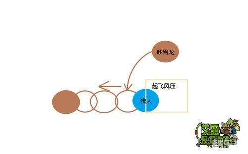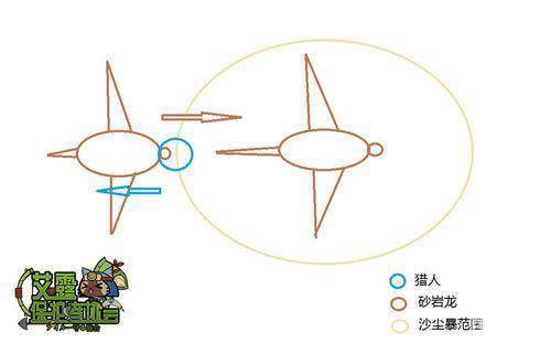 砂岩龙飞起后开始寻找目标,原地空中转身定位然后重摔下来翻滚一周用身体碾压猎人。起飞过程有风压,而砂岩龙在空中需要瞄准目标后才会下砸,所以在其身后,如果要砸你的话他需要转体,在转体过程中可以恢复风压影响。接下来如果它锁定的目标是你,距离过近可尝试面对砂岩龙方向翻滚,因为他的砸击是有一定的抛物线,会有少量安全空间供猎人翻滚逃离。距离远的只需要避开正面即可。