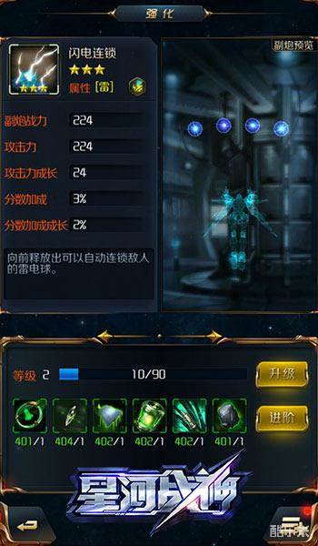 闪电连锁,可谓是大多数玩家选择优先培养的副炮。闪电连锁和闪电瞬击炮一样,是自动锁敌的。闪电连锁是通过释放雷电球来攻击敌机,机甲暴走状态下可以增加到5颗。尤其是5颗连锁雷电球的攻击,足以给BOSS带来巨大的杀伤力。唯一的难度在于这个副炮需要80个零件,最快捷径依旧是寻宝。
