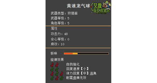 这时候我们发现黄速龙气球完美契合砦蟹副本,别看它是5级武器,可是麻雀虽小五脏俱全,黄速龙气球既有耐震又有回血,是一个实用性极强的笛子。