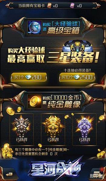 在闯关模式或是在礼包中获得的宝箱卡可以用在寻宝模式中。通过寻宝,你可以获得机甲装备的零件、副炮以及各类雕像等。当然,如果攒够280个钻石也可以进行一次寻宝。但是如此多的钻石对于0元党来说难免有些吃力。因此,小编认为:寻宝靠运气,抽奖需谨慎。