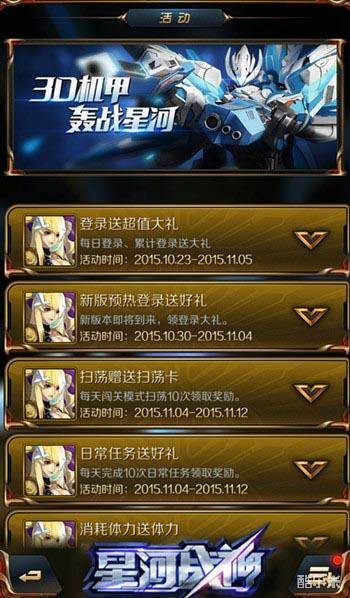 在不同的时期里,《星河战神》会推出不同的精彩活动,这便是你的机会。例如,玩家每天使用10张扫荡卡,系统会自动再送你10张扫荡卡。而玩家每天消耗200体力值,系统会再赠送你50体力值,无形中就获得了更多的资源。此外,日常任务送好礼以及新版登录送好礼等活动也会是你升级路上的一大助力。