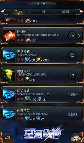 在任务列表中,分为日常任务、主线任务和成就。完成日常任务,可以获得大量的经验值,主线任务主要是零件和经验球的获得,而成就则主要是赚取钻石。此外,通过签到,玩家也可以获得一定量的金币、钻石、经验球以及机甲必杀等。