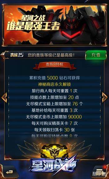 在《星河战神》中,贵族等级对于整体战力的提升十分关键。高等级的贵族,不仅每天可以额外获取扫荡令,节约游戏时间,还拥有神秘商店、旅行商人等稀有道具商店开启的特权,可谓是一开始就赢在了起跑线上。而对于贵族等级在V8阶段的贵族,可谓是这款游戏的小霸主了,贵族等级有很多隐形的便利条件,对于V8之前的福利大家都已经很了解了,下面一起来看看V8贵族将为玩家带来何种改变。