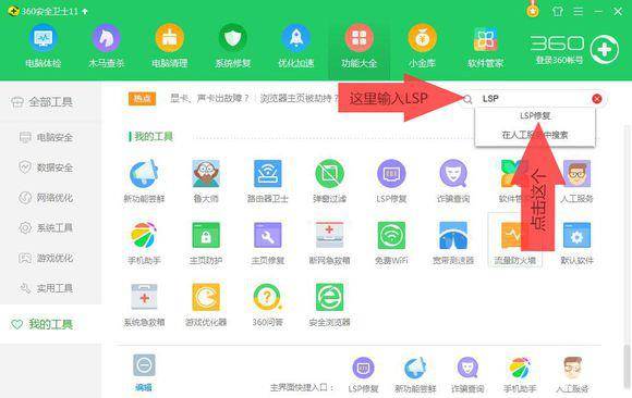 2、从杀(liu)毒(mang)软件里都会自带的小工具里搜索LSP这三个英文字母(这里以360为例)