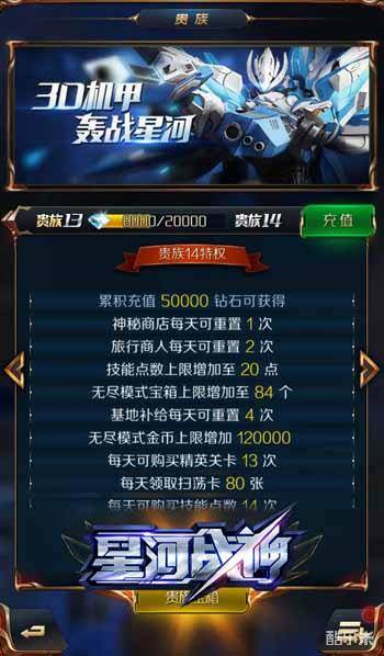技能等级的高低决定了机甲的战力,首先,V13贵族技能点的上限就比非贵族玩家多了10点,其次V13贵族每天可购买的技能点次数高达13次。想必各位玩家也知道,每一点技能点恢复需要5分钟时长。而游戏越到后期,根据关卡的情况就需要选择不同属性的机甲进行战斗。而V13贵族可凭在技能点上的特权,每天多强化自己的机甲,早日点满技能,这样利于之后的各种战斗。