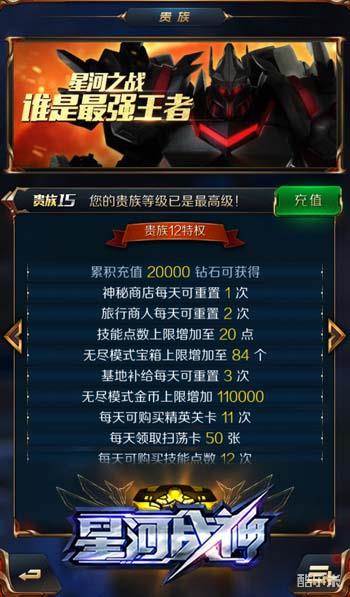 在《星河战神》中,玩家可以通过各种方式提高自己的实力,其中充值提高贵族等级就是其中的捷径之一。提高贵族等级,对玩家在游戏中的实力提升和各方面资源的获取都非常关键,而贵族等级一旦提升到V12的等级,那可真是在星河中横着走,壕无人性特权多。