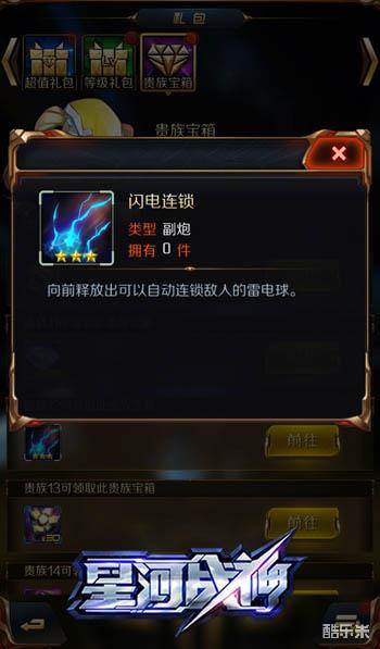 贵族V12用户除了可以通过免费重置次数来购买金币外,游戏为玩家准备的V12贵族大礼包也是非常丰盛的。V12贵族可以领取三星闪电连锁副炮的贵族礼包,让玩家的综合实力得到质的飞跃。