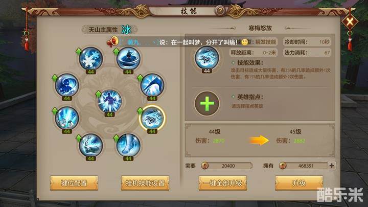 该技能作为天山主要输出技能之一CD不长仅10秒,是具有额外奖励BUFF的,25%的几率造成一次额外伤害,15%几率造成额外两次伤害,运气好的话爆发会相当的高。该技能一定是在起手使用并且经常使用的技能。指点方面就有很多可以选择的了,蓝色指点和紫色指点都相当不错,看各位少侠的喜爱了。