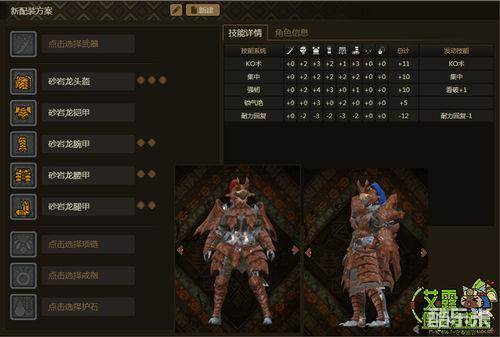 套装属性:KO术+11(增加攻击的气绝效果)、集中+10(大剑、锤、弓蓄力时间缩短5%;双刀鬼人槽积攒效率+15%;太刀练气槽积攒效率+5%)、看破+10(受到攻击后10秒内再次受到的首次攻击伤害降低,一段时间内仅触发一次)、耐力回复-12(减低耐力回复)以及锁气绝+5(无特效触发)