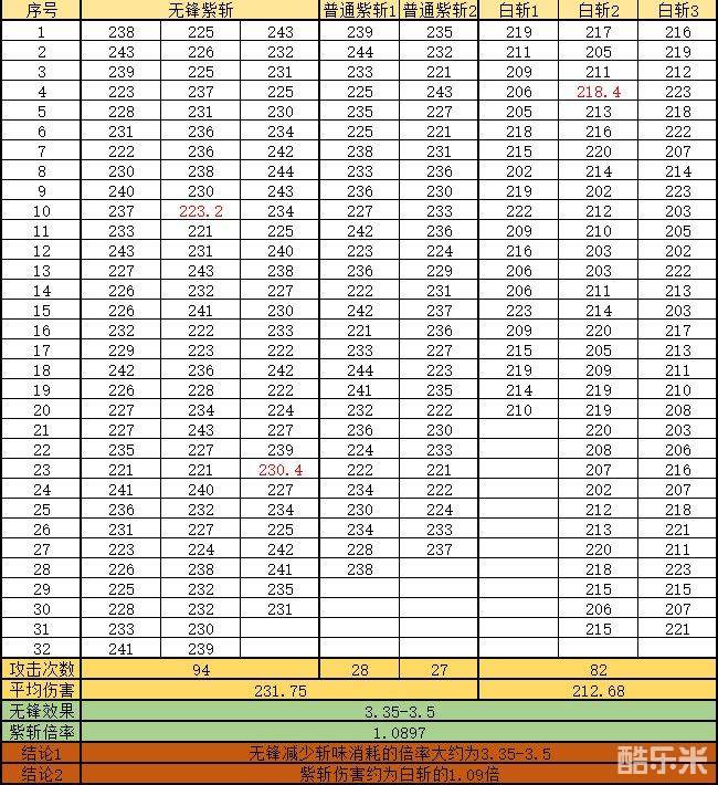 无锋是减少斩味消耗的倍率大约为3.35-3.5,紫斩的伤害约为白斩的1.09倍,那么问题来了,无锋加上紫斩会怎样呢。