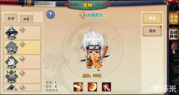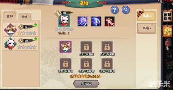 宠物协战:随着宠物等级的提升,可给宠物添加协战宠物,可提升协战队长战力,协战默契等级达到一定的等级可提高人物战力;