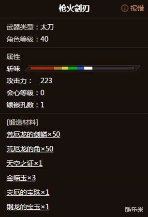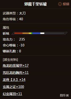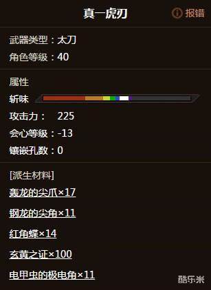 1、轰龙系自带短紫斩,225攻击-13会心等级