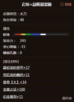 4、晶岩系,超长斩味超高攻击超高负会心243攻击-15会心等级(太刀、双刀、片手独有!)