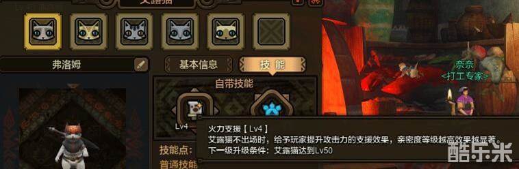 当3~4人组队狩猎时,艾露猫不出场,但会在场外给予猎人火力支援,而且分别可以在lv15,lv30,lv40时候升级!打开艾露猫面板(快捷键O),基本信息盘边有个“技能”,点开“技能”,把火力支援升到4级!