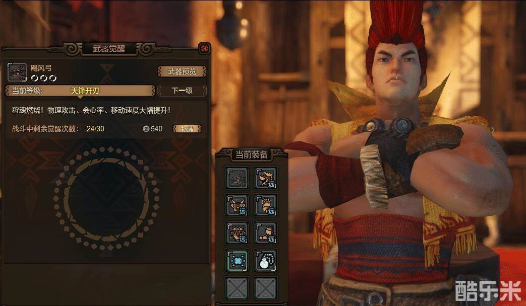 猎人到达lv25,就可以到NPC雷欧那里,对武器进行觉醒。越低级的武器觉醒费用越低,觉醒等级分三级,最高一级,物理武器觉醒后30秒内提升50%攻击力,属性武器物理攻击加15%,属性攻击加150%。觉醒时猎人的移动速度也会上升。觉醒等级跟随装备,派生后依旧保持。觉醒次数用完之后,需要花钱补充