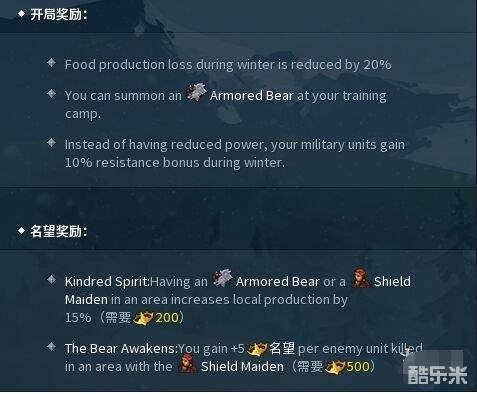 熊的第三个开局奖励是,在冬天作战单位的攻击力不会下降,并且抵抗力增加10%。