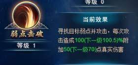弱点击破,寻找目标弱点并攻击,每次攻击造成100%+50点真实伤害,伤害略低于上面的两个技能。
