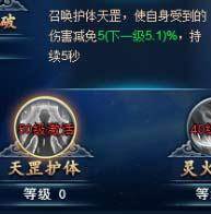 天罡护体:召唤护体天罡,使自身受到的伤害减免5%,升级一次增加01%。不好用的技能,升级一次0.1%的提升太小了,前期不推荐点。后面再补满吧。