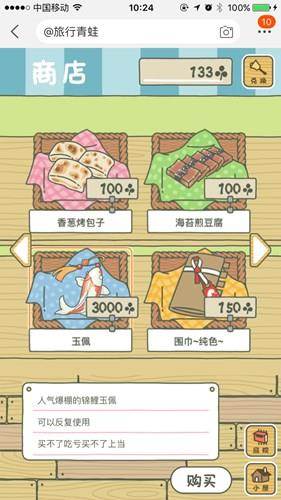 2.玉佩:在商店花费3000三叶草购买,为永久性物品,可无限使用,功能是提高幸运值,让青蛙能够带回更多东西。