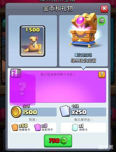 3、以12阶为例,一个绿林团伙宝箱,包括1800金币、250张白卡,50张橙卡,8张紫卡,10%机率能开出传奇卡。
