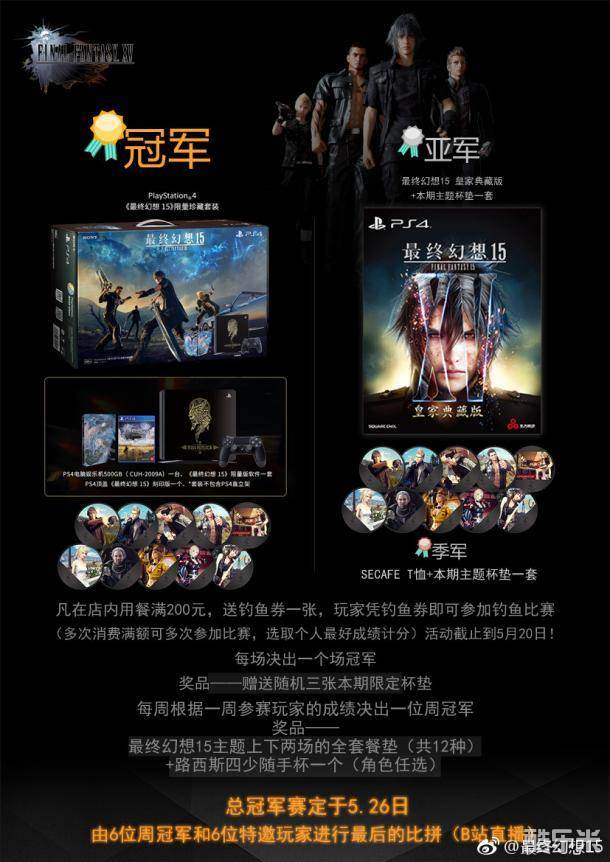 从图片来看,冠军奖品为《最终幻想15》限量珍藏PS4套装,亚军奖品为《最终幻想15》皇家典藏版+主题杯垫一套,季军为T恤和主题杯垫。此外在SE咖啡厅用餐满200元的玩家也可以参与钓鱼比赛,赢家可获得三张主题杯垫。