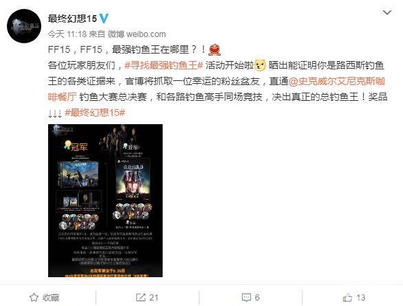 各位玩家朋友们,#寻找最强钓鱼王# 活动开始啦 晒出能证明你是路西斯钓鱼王的各类证据来,官博将抓取一位幸运的粉丝盆友,直通@史克威尔艾尼克斯咖啡餐厅 钓鱼大赛总决赛,和各路钓鱼高手同场竞技,决出真正的总钓鱼王!