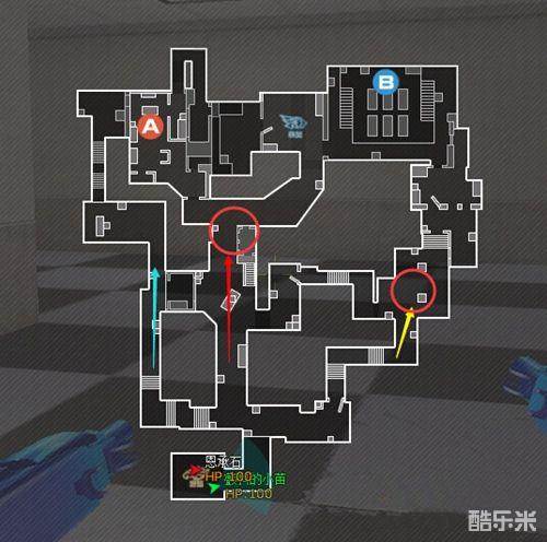 小编认为从左路蓝色箭头和中路红色箭头处进攻最佳右侧黄色箭头和圆圈处不太推荐,原因是掩体较多如果队友比较分散很容易进攻失利。