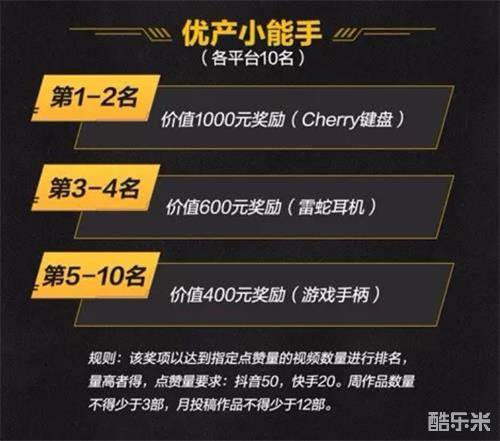 “优产小能手”(每平台各10名),该奖项以达到指定点赞数的作品数量来进行排名。点赞量要求为:抖音50个,快手20个,且周作品数不低于3部,月作品数不低于12部。