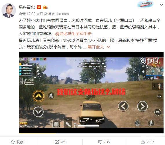 局座张召忠今天在微博分享了自己玩《绝地求生:全军出击》的心得,同时也为大家介绍了游戏的创新模式“决胜五军”,局座称把传统谋略融入游戏中,会让大家感到别有情趣。