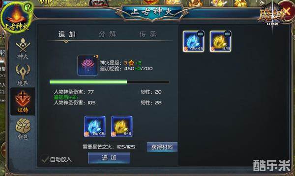 全新的神火装备总共分为七大品类,每个类型均有8个部件,分别可装配于8个对应的神火格位中,每个神火格内的神火都将提供不同的附加属性效果。玩家在8个部位上装上具备不同属性优势的神火,即可完成神圣伤害、暴击、暴击率、韧性、生命等其中的任意一项属性的加成和升级。此外,一些稀有神火还可以通过结合,产生套装属性加成!不同的搭配方式会有着不同的属性的提升效果,每个玩家都可以根据自己的玩法、定位来个性化搭配神火的属性,同时也让自己的战力逐层提升,点燃你的战力之光!