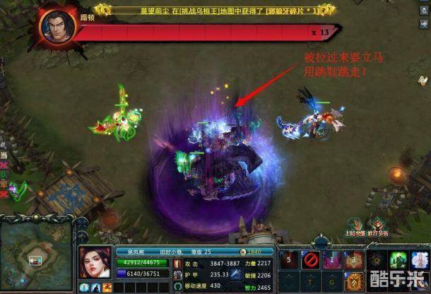 箭头下人物时间到被拉到BOSS旁边,这时要注意第一时间跳走,这时BOSS伤害比较高~