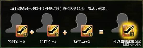 球队每名球员均会被随机分配6项特性,并且每项特性有特性点数,当上场球员中,拥有同种特性点数达到11点,即可激活该项特性,但是只有品质为A-及以上品质的球员才有特性;