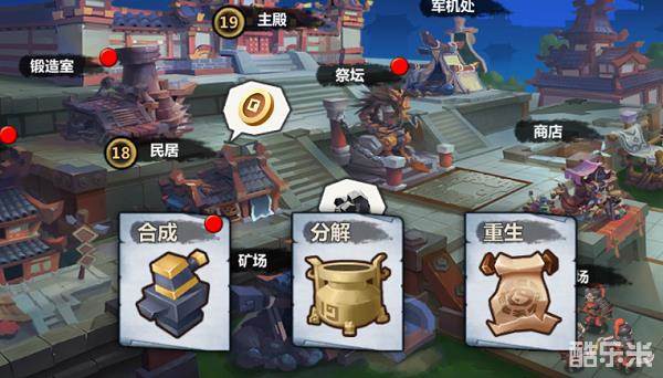 《乱世战纪》中锻造室主要分几大分类:装备合成、装备分解、武将合成、武将分解、武将重生。