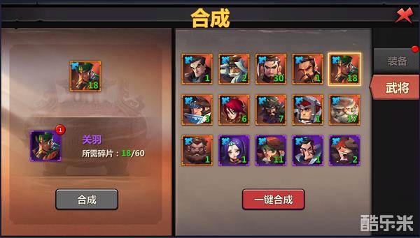橙色武将:需要60个武将碎片合成;