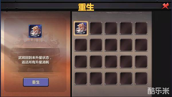 前期如果没有好入手的武将没关系,升级得到更好的武将时就可以选择重生了,重生以后武将会回到未升星状态,返还所有升星消耗。
