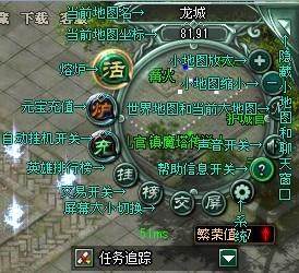 “充”字是为玩家提供详细了解充值方式的超链接。“挂”字是挂机自动打怪等。“榜”字是查看群英榜、战神榜和成就榜等等的榜单排名详情。“交”字是控制交易状态的。