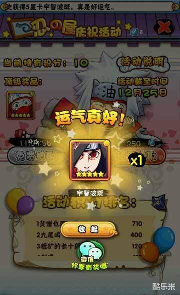 4、以上三种是小编爱旅行的猫经常使用的开五星忍者的方法,不过个人比较推荐忍之屋庆祝活动,出五星的概率是比较大的,新手玩家们可以攒一些钻石,等有活动的时候试试手气。