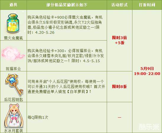 5月9日19:00-22:00期间,【萤火虫魔瓶】【祝福祥云】限时3倍+5折,【后花园钥匙】开启限时8折,还有【水冰月套装】大放送,千万不要错过哦!