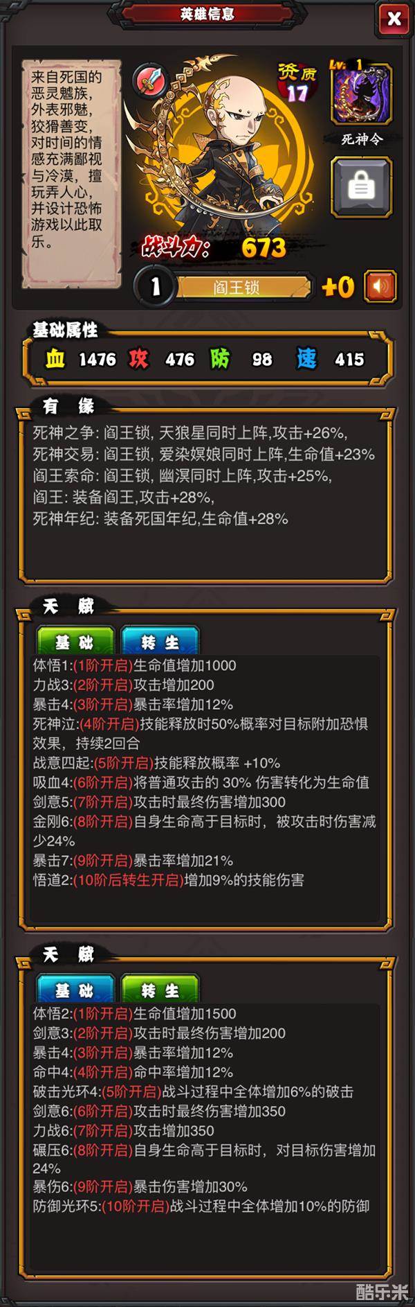基础属性:血 1476 攻 476 防 98 速 415