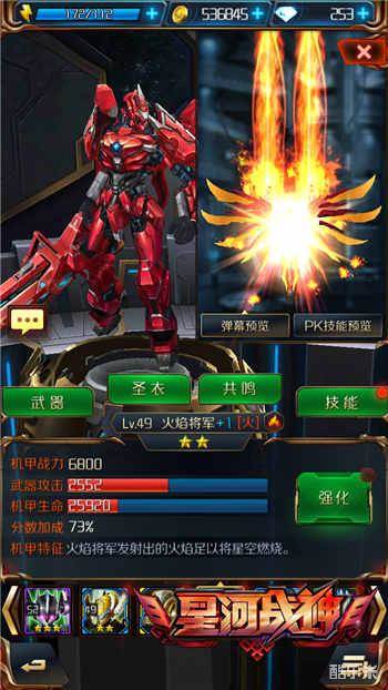[火焰将军]二星机甲,技能[地狱亚火]、[火神炮]、[火之余烬]、[怒火凤凰]。点评:[火焰将军]属性火,签到七天即可获得哦~[火焰将军]攻击和技能特效都很华丽!并且前期和后期都有不俗的伤害,获得的方法也比较简单!完全可以从前期练到后期。小编也是非常喜欢这款机甲!