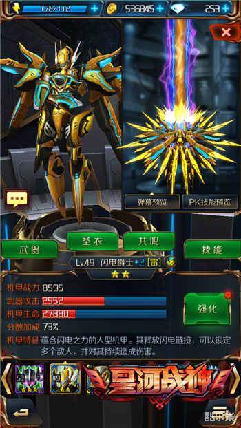 [闪电爵士]二星机甲,技能[交叉闪电]、[电磁涡轮]、[电闪雷鸣]、[符合超载]。点评:[闪电爵士]属性雷,金币购买![闪电爵士]这款机甲是十分酷的!技能和攻击都是大范围AOE伤害,并且有着连续不断的攻击,攻击的弹道可以偏移和连锁,适合新手玩家。锁定BOSS后不不需要专注于弹道的控制,只需要躲闪技能即可,但是后期没有爆发,喜欢[闪电爵士]的玩家也可以培养!