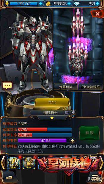 [钢铁骑士]三星战甲,技能[幻影斩]、[灵魂之矛]、[十字巨盾]、[骑士精神]。点评[钢铁骑士]属性钢,寻宝获得![钢铁骑士]是最完美的一个机甲,伤害爆炸,有着完美的体型、防御、攻击三结合!暴走模式开启后技能[十字巨盾]在[钢铁骑士]周围形成一个防护罩,可以抵挡大多数技能伤害!如果你抽到这款机甲就快培养吧!