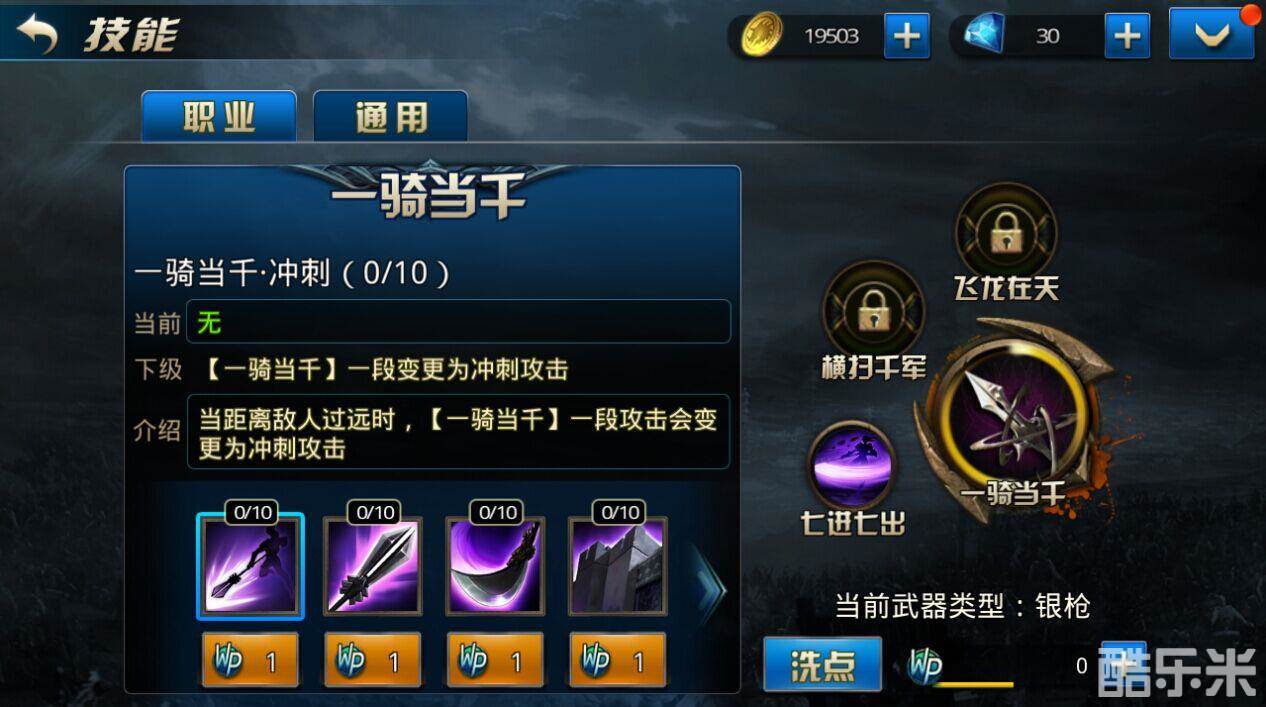 一骑当千•银枪(龙戟):银枪(龙戟)造成的伤害增加,建议必点。