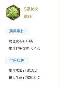 接下来就是铭文选择了,绿色铭文中鹰眼是增加物理护甲穿透6.4,所以就选择鹰眼了,加满了就是64点穿透了。