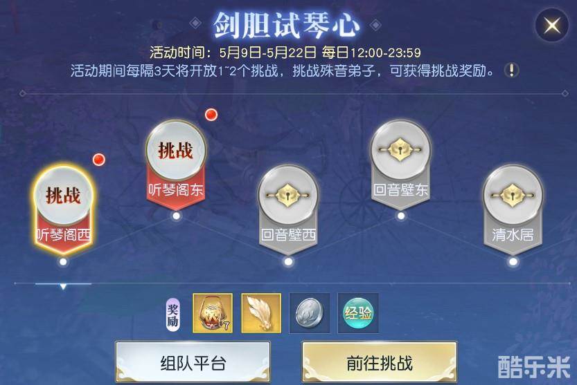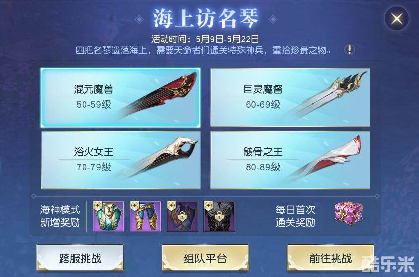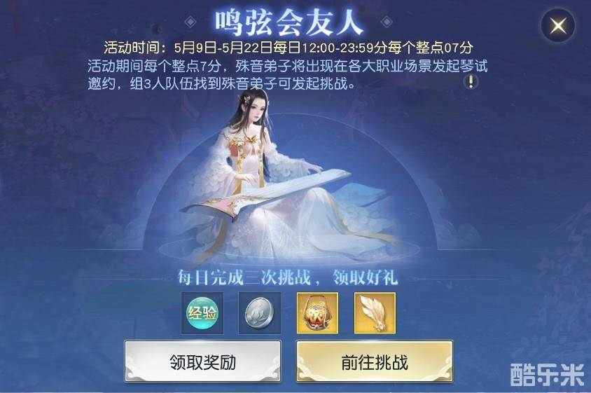 “一曲诉衷肠”活动中,殊音弟子每天都会考验天命者们的琴曲知识;“剑胆试琴心”与“鸣弦会友人”活动中,天命者们需要凭借个人实力或是组成3人队伍挑战殊音弟子,以武会友;“海上仿名琴”活动将开放特殊的神兵幻境,让天命者们进入其中、搜寻失落的四把名琴。完成任务,就能收获包括海量经验银币、玲珑丝、金翅羽、紫色套装、传奇装备、青龙石、幻彩虹光等在内的珍稀奖励!