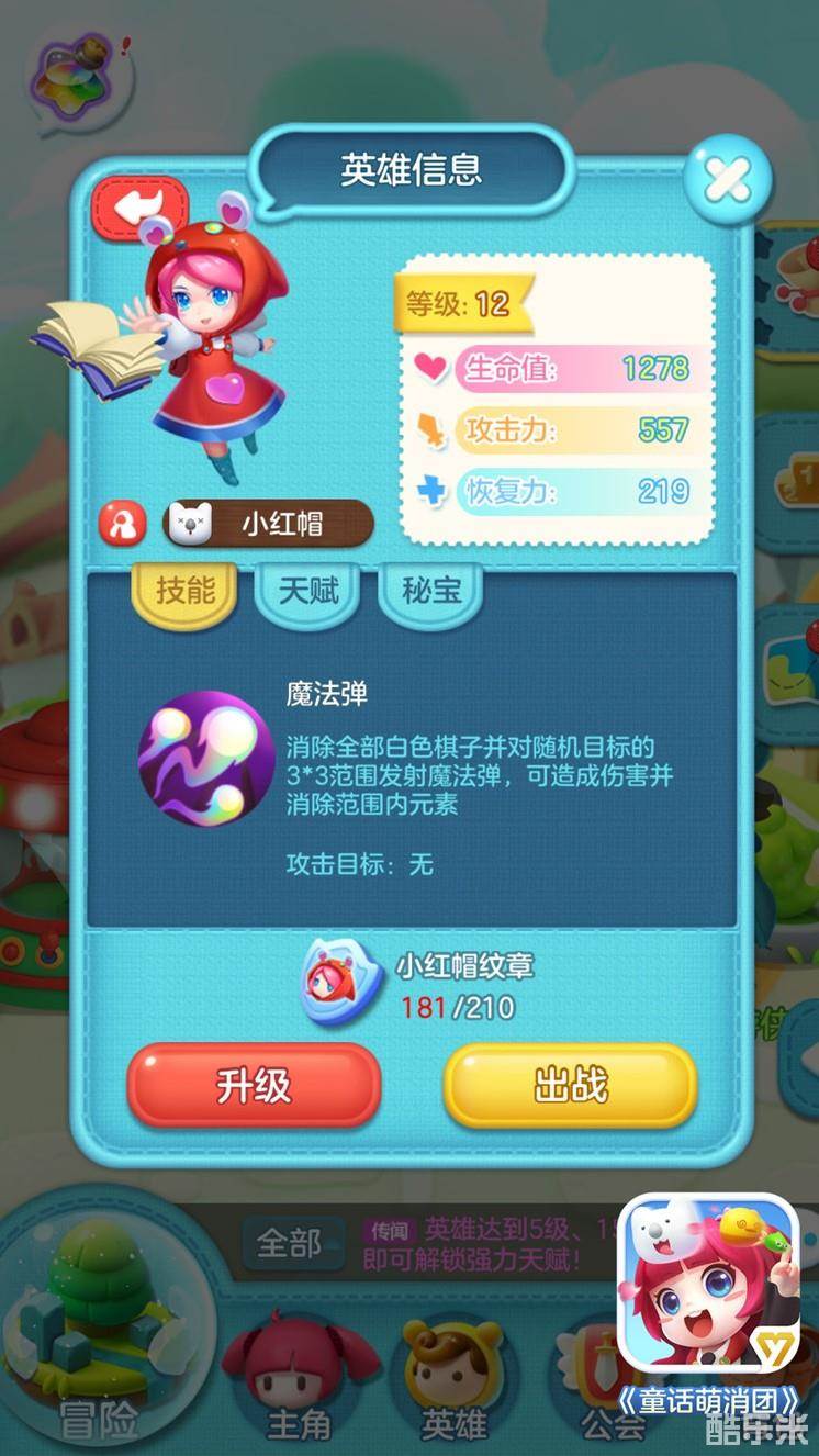 小红帽在格林兄弟的笔下,是一个不谙世事的善良小女孩,但在《童话萌消团》里,作为白色阵营里的唯一女性,小红帽不仅能输出,还可以消除异常元素。在解锁第2章之后,就能获得英雄小红帽。当消除过程中,小红帽周围闪起了白色光芒,就能点击释放技能消除全部白色棋子,并对随机目标发射3*3范围魔法弹,消除该范围内的元素。在英雄养成初期,小红帽是非常实用的女团成员之一。