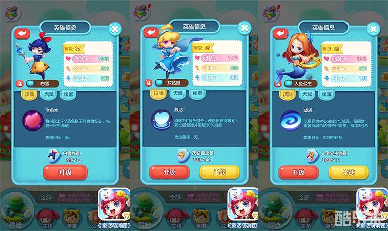 而蓝色阵营的英雄则以辅助和控制类技能为主,在这个阵营中的白雪、灰姑娘、人鱼公主在释放技能的时候,都能散发出蓝色的如海洋般温柔的光芒。白雪和灰姑娘都是辅助系英雄,使用技能可以回复血量。人鱼公主是一个输出同时带控制的强大英雄,其旋窝技能可以生成5*5的目标旋窝带,每回合能重制旋窝内的棋子和怪物。